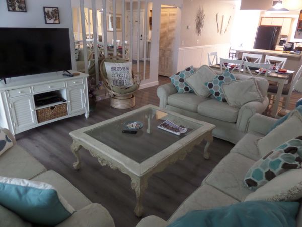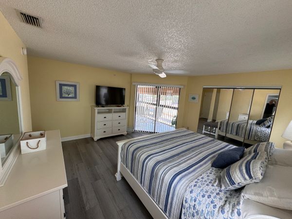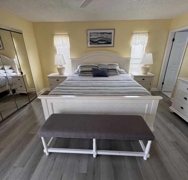Beach is in short walking distance, beach stuff, beach towels, and beach chairs. King Bed In main room, queen bed in second, two bathrooms. Fully stock kitchen, pots, pans, dishes, utensils, coffee maker, toaster, and more. Large screen TV, cable, high speed internet, and more.